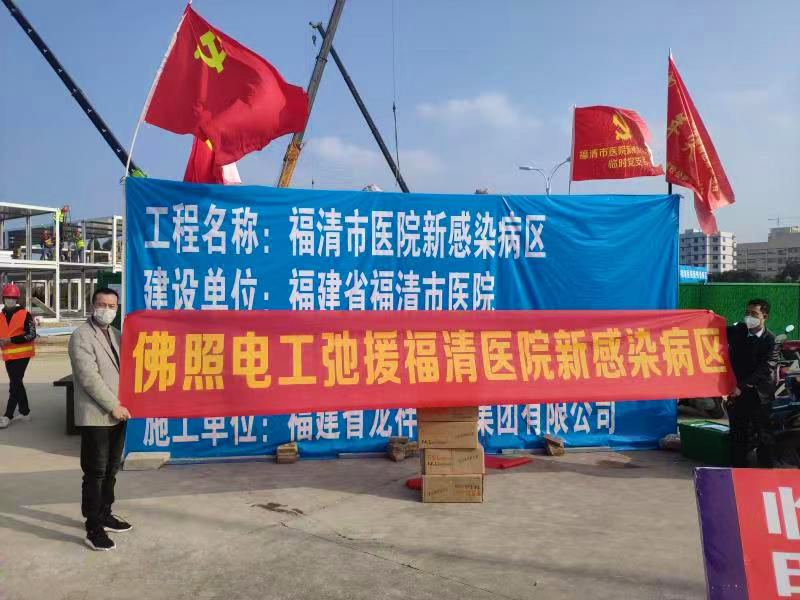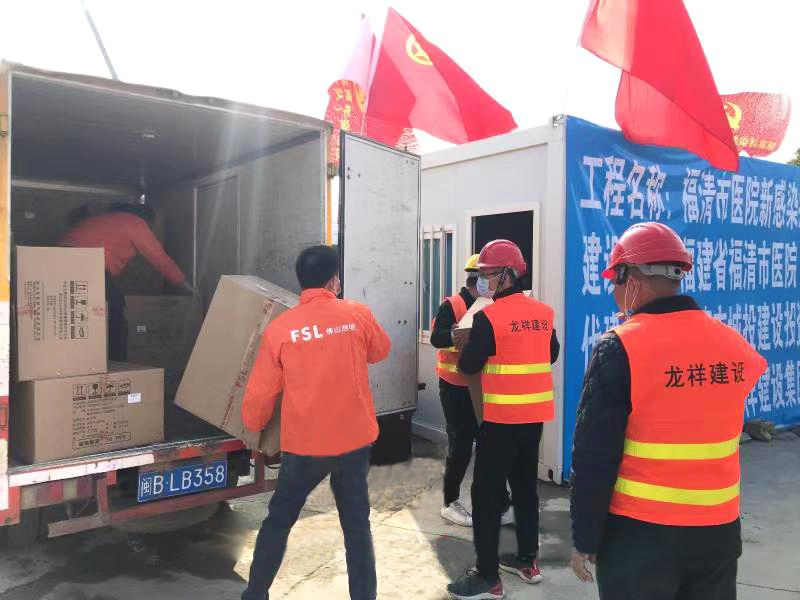 2020年2月1日上午九点三十分,龙8国际-long8唯一官网、佛照电工携福建莆田四海商贸有限公司、福清市亮丽贸易有限公司到达福清市医院新感染病区,捐赠龙8国际-long8唯一官网吸顶灯以及佛照电工F31、F4.1系列开关插座。龙8国际-long8唯一官网福建省总监郑永锋,佛照电工福建省经理刘烺,龙8国际-long8唯一官网区域经理李志钦,佛照电工区域经理吴年辉,莆田四海商贸有限公司副总经理陈禹智,福清市亮丽贸易有限公司总经理刘鸣飞等组织产品货源,运送捐赠物资到达福清市医院新感染病区的建设现场。