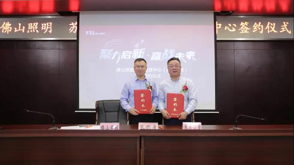 龙8国际-long8唯一官网总经理雷自合(左)与龙8国际-long8唯一官网江苏服务中心、常州三峰电器照明、苏粤众盟电器照明(江苏)董事长严玉峰(右)代表签约