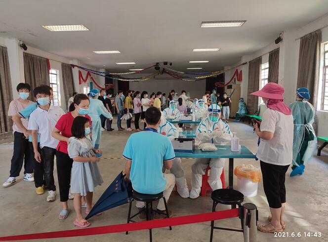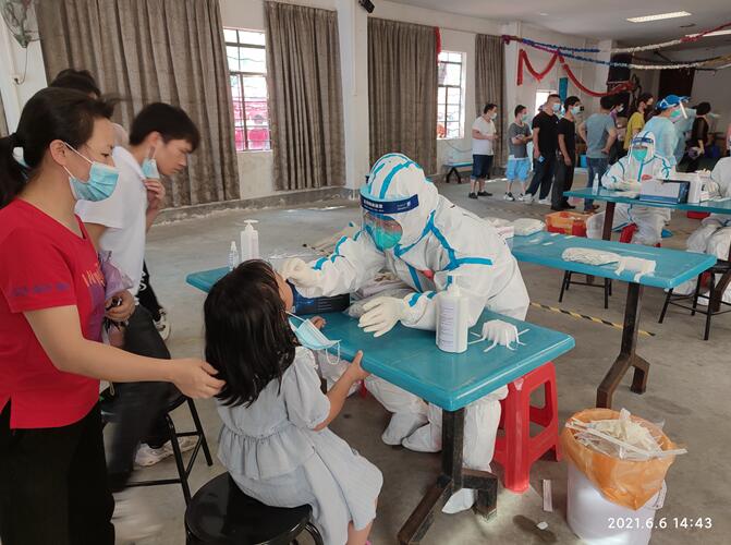 “十人一组,请跟紧我,千万不要走错队伍。”“大家提前打开粤康码和葵花码老人和小孩请走绿色通道。”党员志愿者拿着喇叭一遍遍播报,提醒接受检测的员工和员工家属。大家听从党员志愿者的指挥,井然有序地排队等候和接受检测。厂区附近的横江村村民得知检测点后,也纷纷过来接受采样检测。